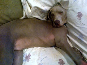 I slept on the way home and then went straight to my bed. I was never so happy to be home. When I went to the bathroom later on Dad left the gate open by mistake and I just went to the side door – I never saw Mom so happy to see me. Here I am all sacked out. I got a good report card and here it is.
