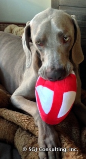 Well, I finally got to meet Victoria and her husband Mark since they are having a baby soon and Dad was taking pictures. They brought a toy for the pictures and I was not having any of it. I saw that toy, went into the bedroom and took it out of the bag and paraded with it in the back yard. I even dropped it in the mud – that will show Dad to pay attention to someone else besides me.